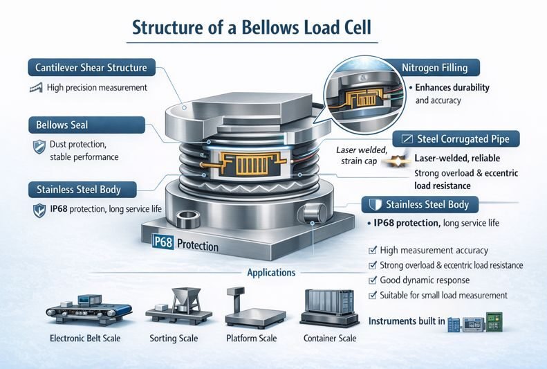 벨로우스 로드셀은 스테인리스 스틸로 제작되며 용접으로 밀봉되어 IP68 보호 등급을 갖추고 있습니다.