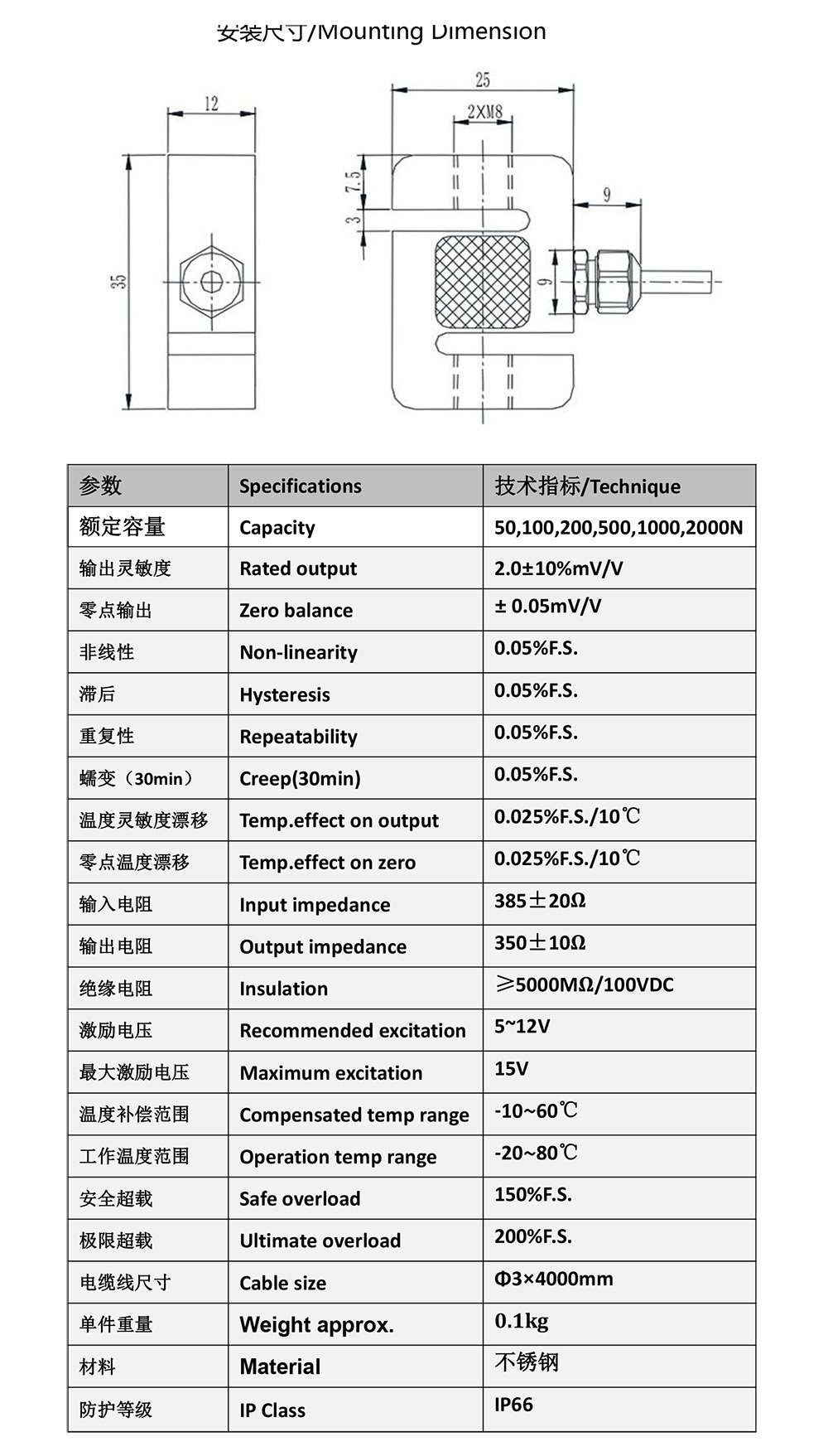 20-2000N Stainless Steel Tension Compression Force Sensor FA404 is a model of our brand FIBOS FA4-Series, Tension Compression Force Sensor FA404 can be used to measure compression and tension force 20N,50N,100N,200N,500N,1000N and 2000N capacity, its Rated output range is 2.0±1%mV/V, and its Zero Balance range is ±2%F.S..