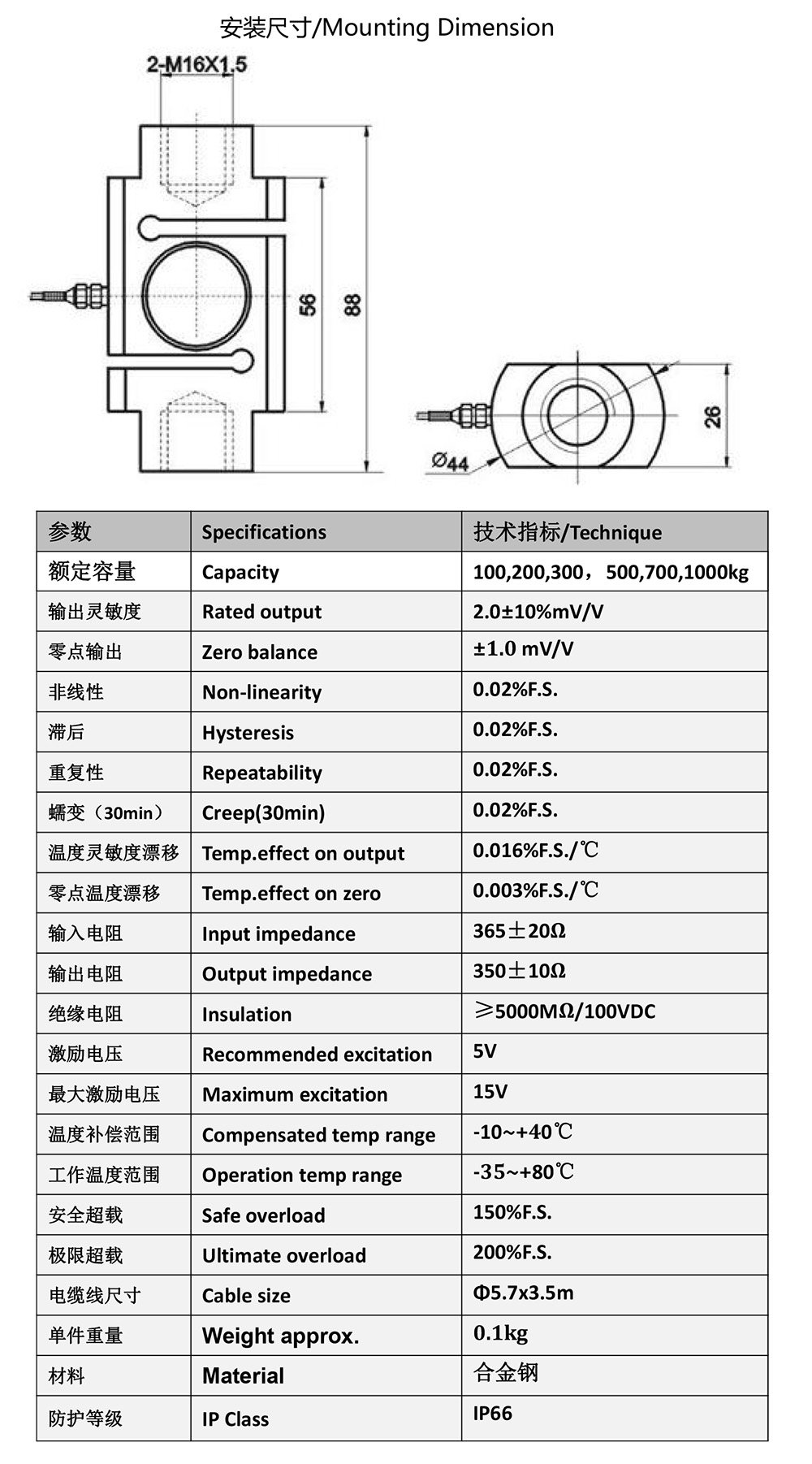 3t Alloy Steel Tension Compression Force Sensor FA904 is a model of our brand FIBOS FA9-Series, Tension Compression Force Sensor FA904 can be used to measure force of tension and compression 3t capacity, its Rated output range is 1.0±10%mV/V, its Creep(30min) and Repeatability both ≤0.1%F.S., its Non-linearity and Hysteresis both ≤0.2%F.S..