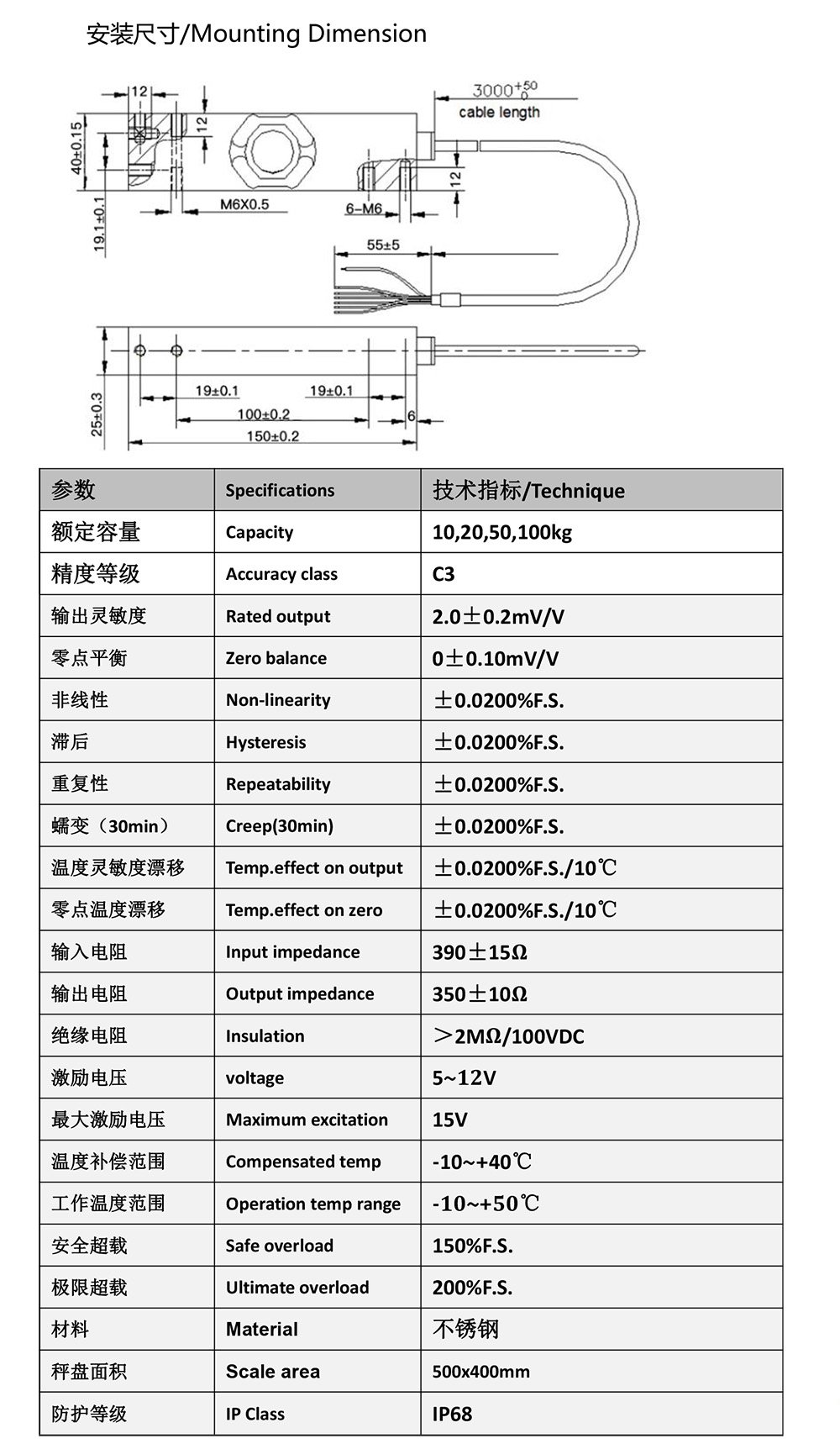| Rated Load: | 50kg~1000kg | Sensitivity: | 2.0000±0.002mV/V |