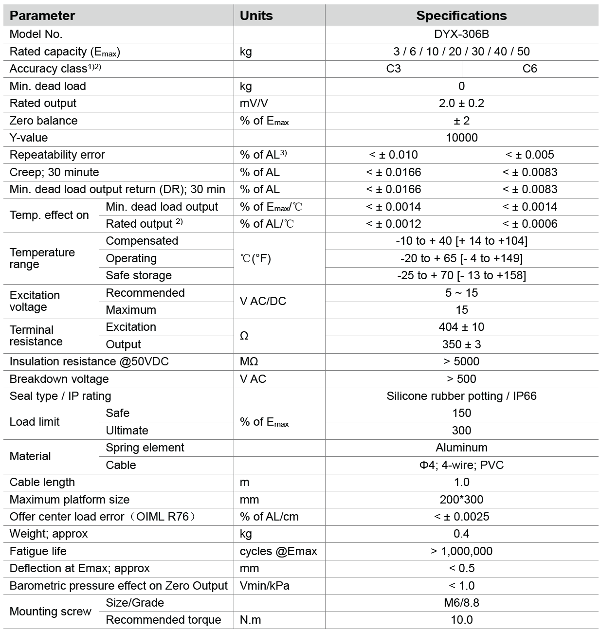 DYX-306B Single-Ended Beam Load Cell Specifications