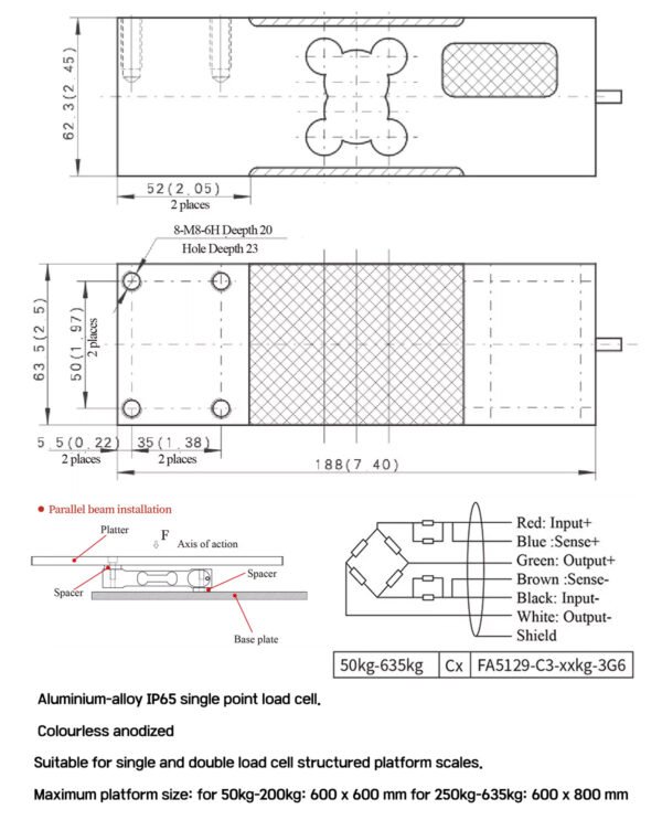 | Recommended Scale Size | mm | 50–200kg: 600×600 / 250–635kg: 600×800 |