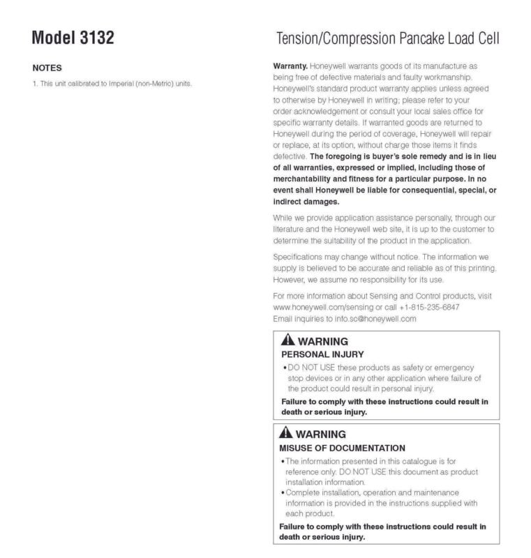 Honeywell Model 3132 Tension/Compression Pancake Load Cell