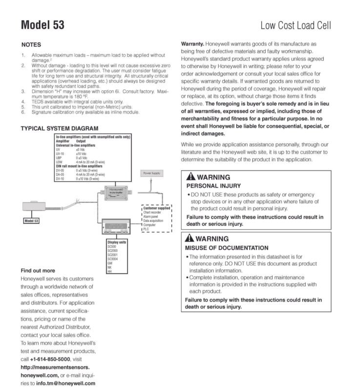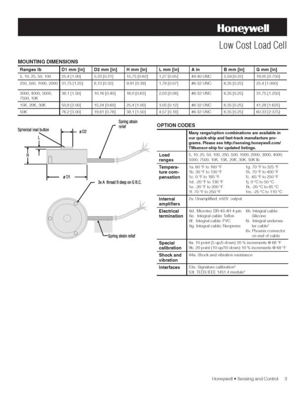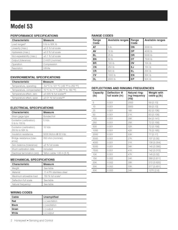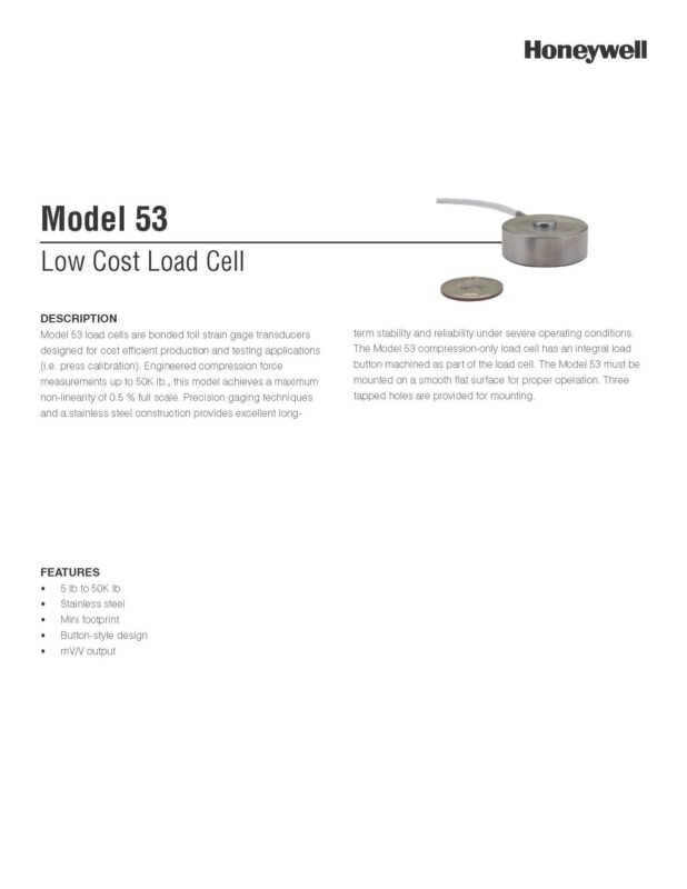 Model 53 load cells are bonded foil strain gage transducers designed for cost efficient production and testing applications (i.e. press calibration). Engineered compression force measurements up to 50K lb., this model achieves a maximum non-linearity of 0.5 % full scale. Precision gaging techniques and a stainless steel construction provides excellent long-term stability and reliability under severe operating conditions. The Model 53 compression-only load cell has an integral load button machined as part of the load cell. The Model 53 must be mounted on a smooth flat surface for proper operation. Three tapped holes are provided for mounting.