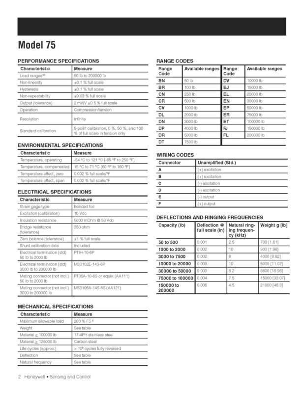Honeywell’s Model 75 load cells are engineered for applications such as materials or product fatigue testing, which involve an extremely large number of cycles or occasional overload conditions. These fatigue rated load cells have load ranges from 50 lb to 200,000 lbs and achieve a non-linearity of 0.1% full scale. The superior design of these bonded foil, strain gage compression and/or tension load cells permits a fatigue life of 1 billion cycles (zero to full scale).