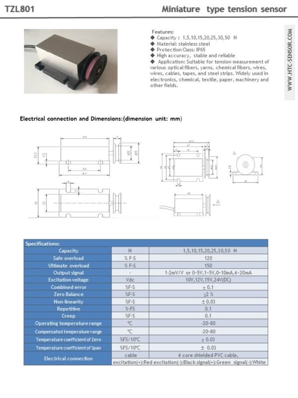 It adopts a 3-roller structure, with selectable roller materials such as hard-anodized aluminum alloy, chrome-plated alloy steel, plastic, or ceramic, providing high measurement accuracy. The compact design allows easy installation and offers excellent stability. It outputs a linear voltage signal of 1.5 mV/V, which can be connected to a transmitter for 0–10 V or 4–20 mA output. The sensor is suitable for various optical fibers, yarns, and chemical fibers. Ideal for tension measurement, it is widely used in electronics, chemical, textile, paper, machinery, and industrial automation measurement and control applications.