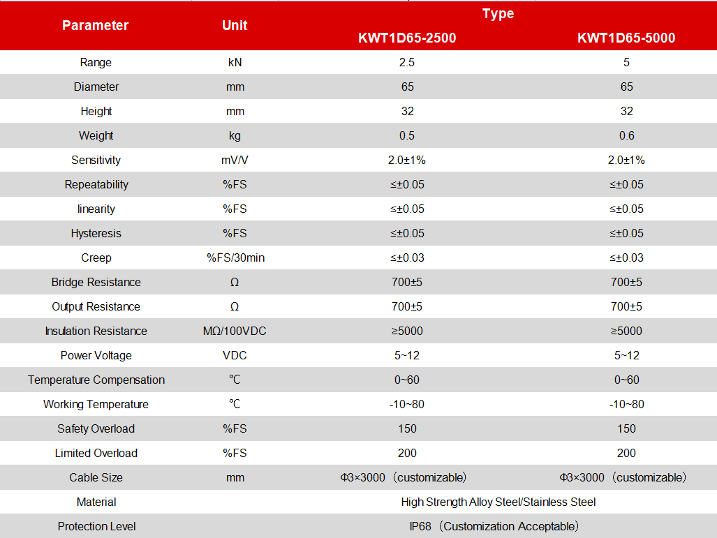 KWT1D65 series can measure tension load and compression load. This series has multi-range from 2500N to 5000N can be choosen. It can work normally at -10℃ to 80℃, the temperature compensation range is 0~60℃. There are four countersunk holes in the circumferential direction of the sensor, which is convenient to connect with the bottom surface. Due to the small height size, the load cell is fit for using in a vertical space-constrained environment. It can compensate the influence caused by load eccentricity, while keeping high precision and reliability.