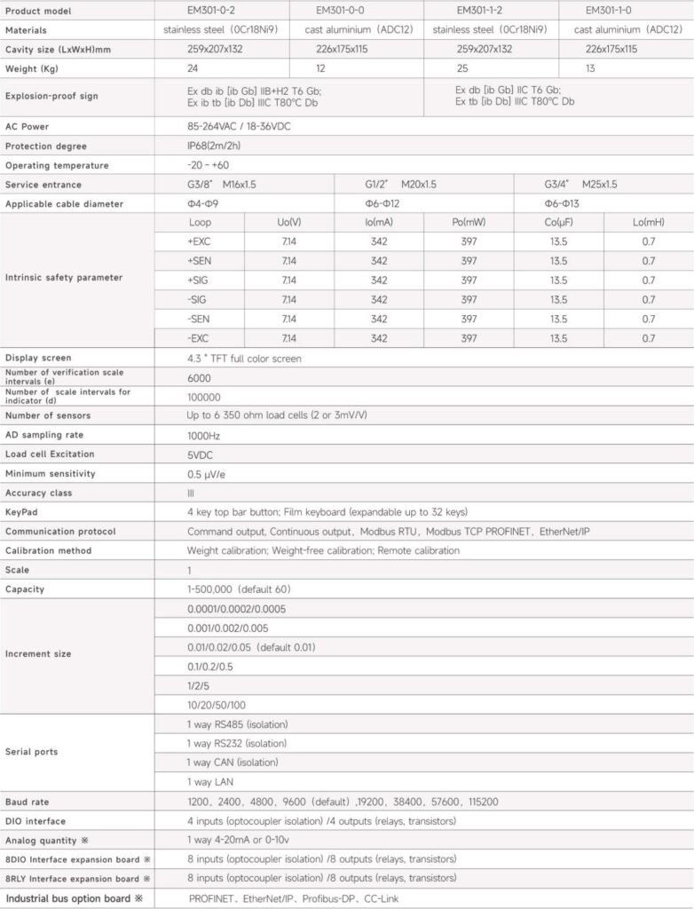 EM301은 산업용 공정 제어 및 동적 계량에 최적화된 방폭형 무게 표시 및 제어기입니다. 본질 안전 설계 및 내화 구조를 채택하여 가스·분진이 존재하는 폭발 위험 구역에서의 안전한 계량 제어를 가능하게 하며, 일반 계량부터 연속 배합까지 폭넓은 응용이 가능합니다. 다양한 PLC 통신, 입출력 인터페이스, 고해상도 컬러 디스플레이를 갖춘 이 컨트롤러는 정밀한 공정 제어를 위한 최적의 솔루션입니다.