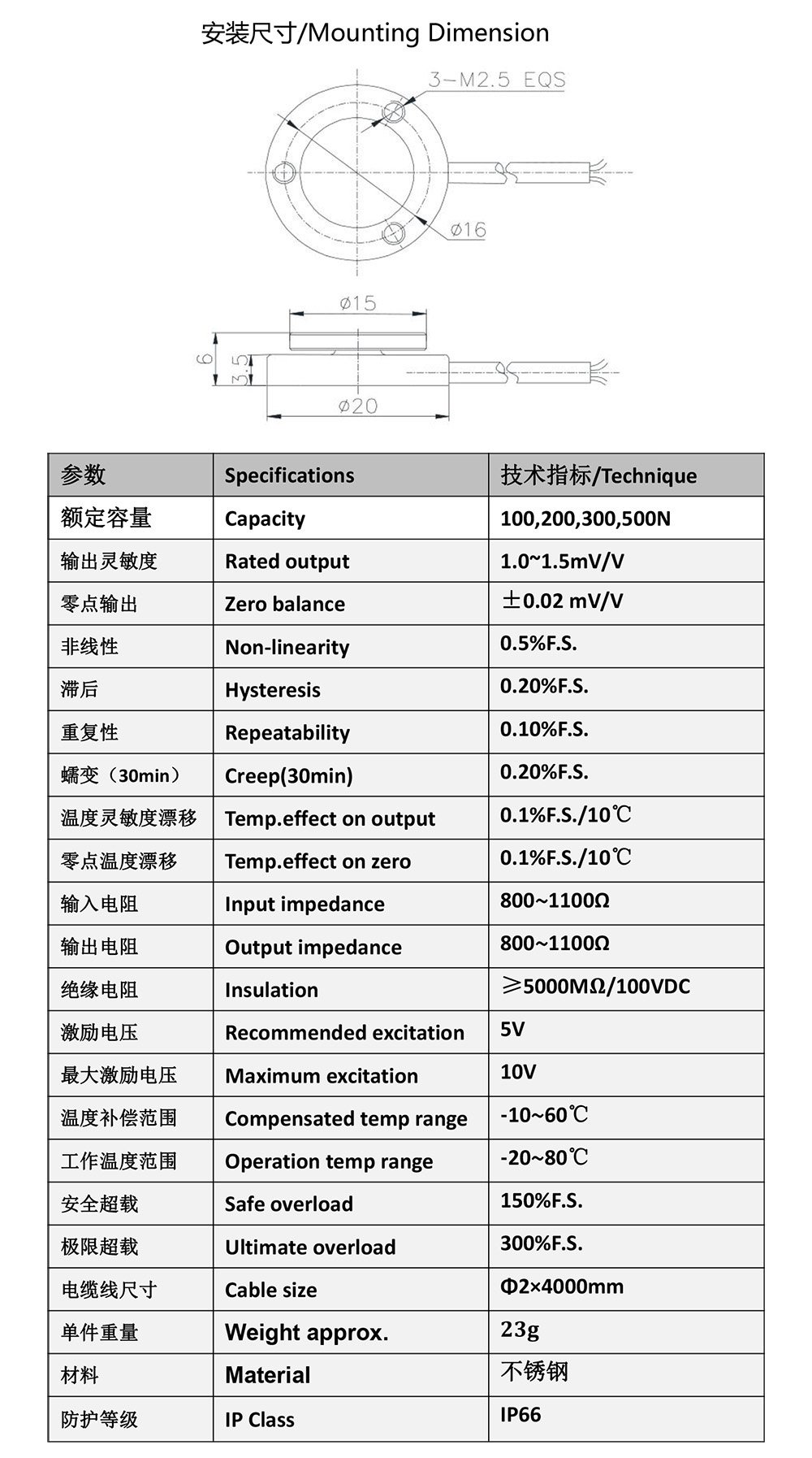 20kg The Creep ≤0.05%F.S. Stainless Steel Spoke Type Load Cell FA122B belongs to FA122 which is in Spoke Type Load Cell category of our brand FIBOS FA1-Series, Spoke Type Load Cell FA122B can be used to measure load 20kg capacity, its Creep(30min) ≤0.05%F.S., its Non-linearity and Repeatability both ≤0.1%F.S., and its Hysteresis ≤0.2%F.S..
