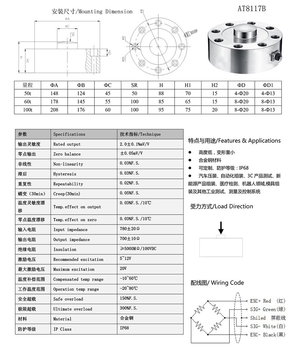 이 제품은 니켈 도금된 고급 합금강을 사용하여 제작되었으며, 신호 안정성과 높은 내간섭성을 갖추고 있습니다. 협소한 공간에도 설치가 가능하며, 다양한 산업의 인장 및 압축 시험 장비와 자동화 시스템에 적합한 고안정성 센서입니다.