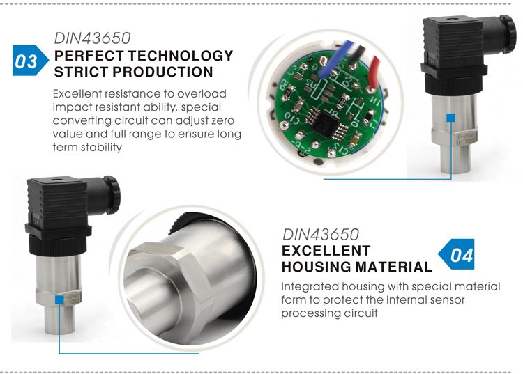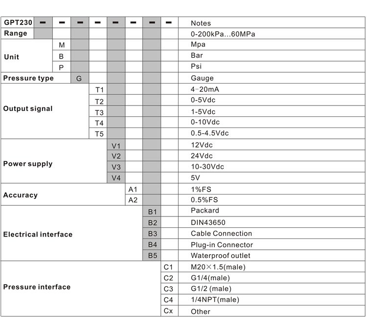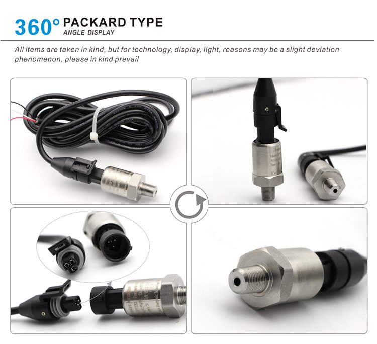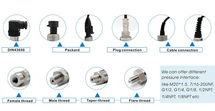 Compensated temperature-10~80℃MediumAll corrosive mediums that could be used with 1Cr18Ni9Ti and ceramicOutputTwo wiresThree wires4-20mA1-5V/0-5V0.5~4.5V0~10VPower supply12-36V12V/24V5V12V/24VInsulation>100MΩ@50VElectric strength500V@60 secondVibration/ shock10g/5~2000HZ,axes X/Y/Z20g sine 11msDurability2×106 pressure period @25℃Electric connectionPackard connector, Hirschmann connector, aviation plug, fixed cable sleeve, water proof cable connectionPressure connectorG1/2, G1/4, NPT1/4, 7/16-20UNF, M20×1.5Pressure typeGauge pressure, absolute pressureResponding time10msCertificateExplosion-proof type E /RoHS / CEElectromagnetic compatibility