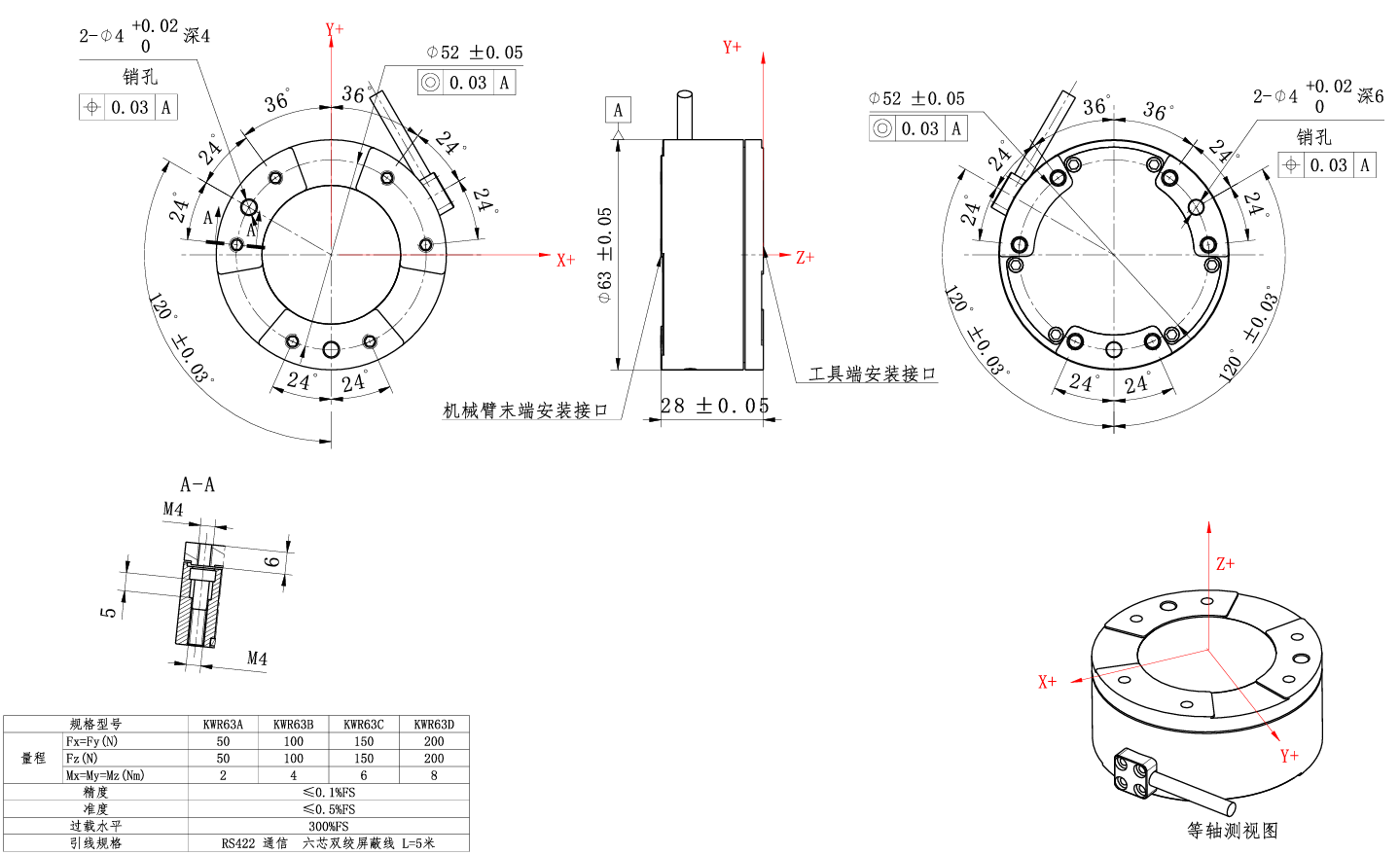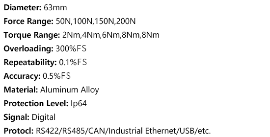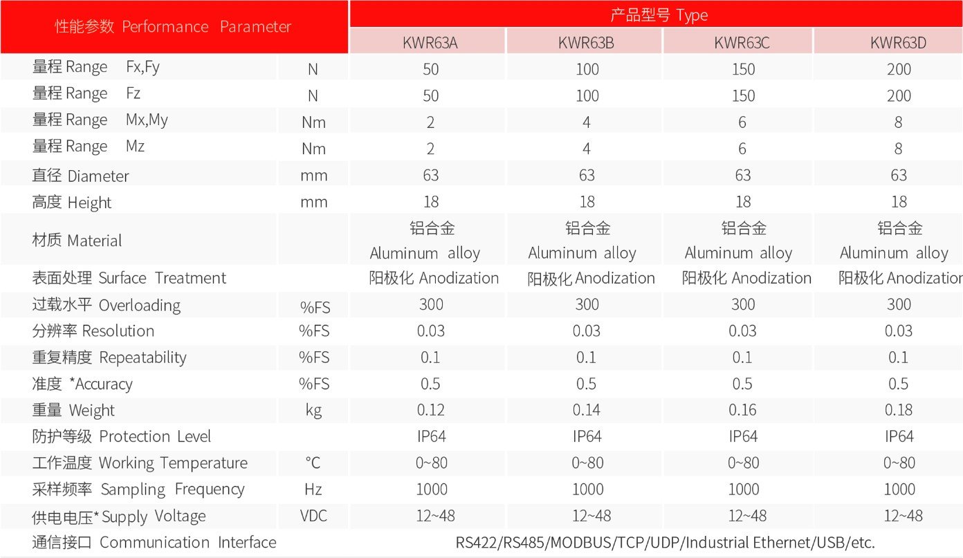 - The KWR63 series is a compact six-axis force sensor with a diameter of 63 mm and a height of 20 mm, which is widely used at the end of small collaborative robots. The sensor self outputs digital signal (RS422, RS485), if you need other communication protocols, it could be equipped with converter box. Before using, the range of the required measuring force should be determined in order to select the suitable sensor. If the range cannot be determined, the sensor with the largest range should be selected to determine the range, and then the appropriate sensor should be selected.