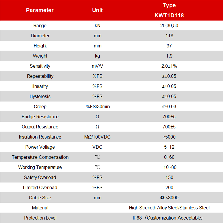 KWT1D118 series has big rated load can be choosen, including 20kN, 30kN and 50kN. The rated load can be customized if the customer has other requirements about range.