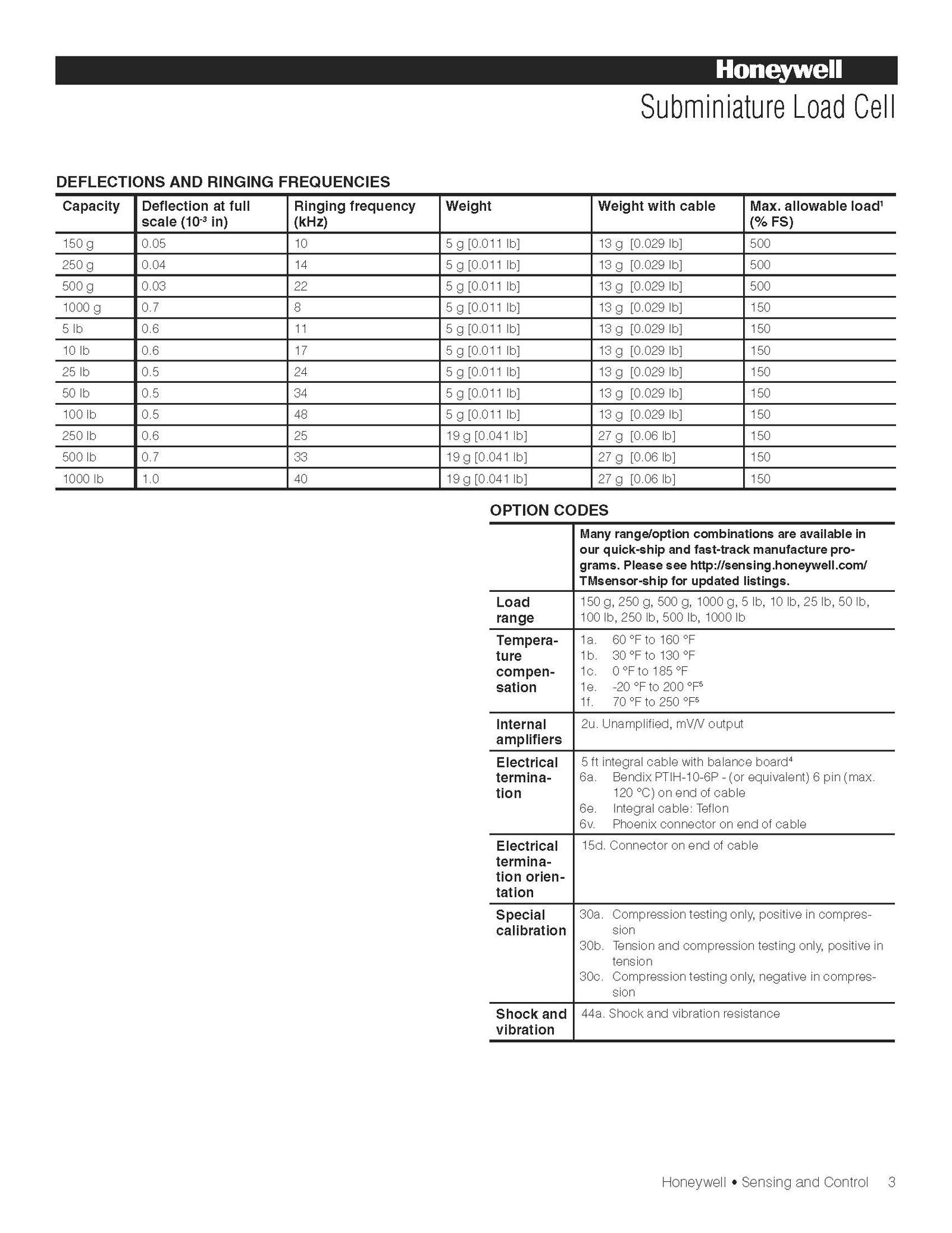 Model 11 (tension/compression) subminiature load cell is designed to measure load ranges from 150 g to 1000 lb. With subminiature dimensions, including diameters from .50 in to 0.75 in and height of 0.38 in, these units are easily incorporated into systems having limited space. The model achieves a non-linearity and hysteresis of 0.5 % full scale respectively and a frequency response of up to 58 kHz. A balance module is included in the load cell’s lead wire cable for zero balance, and should not be removed.
